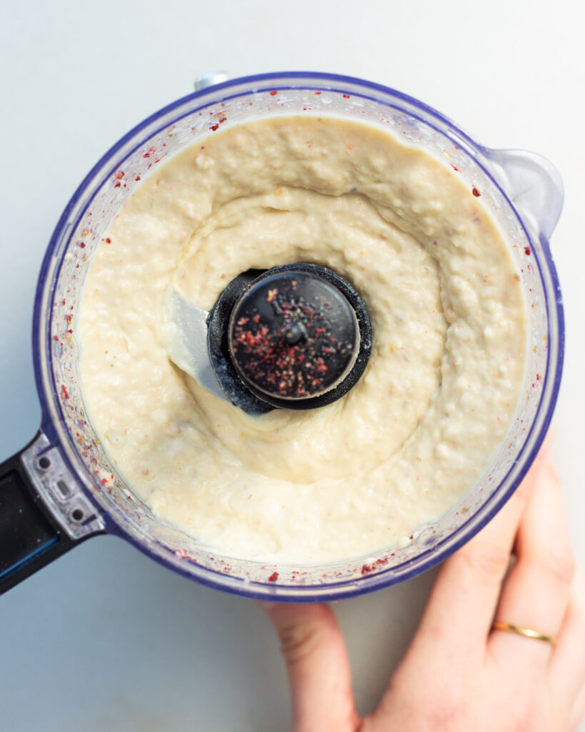 Since this dip uses a decent amount of oil, I’ve found some people have luck making it in a blender. It just takes a bit more patience, and a LOT of scraping down the sides of the blender. But soon, it should give you a nice, creamy dip!