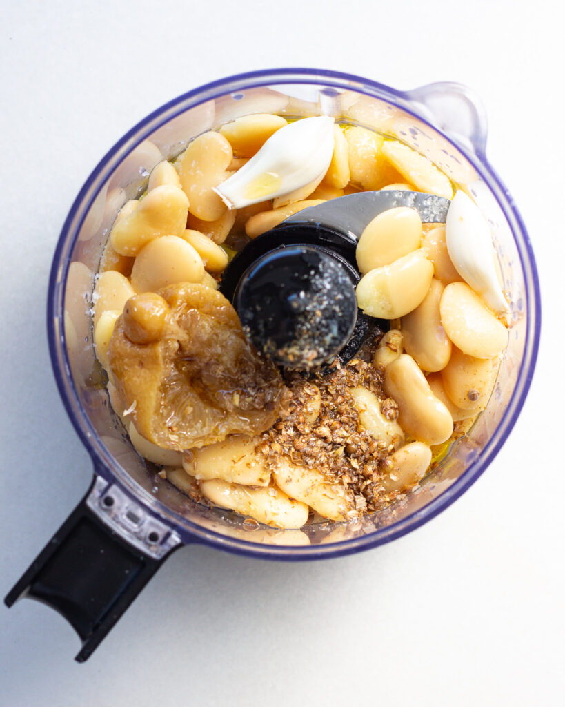 - Add the beans, preserved lemon, crushed coriander seeds, sumac, garlic cloves and oil to a food processor. Juice in 1/2 of the lemon. Process until smooth, about 2-3 minutes.