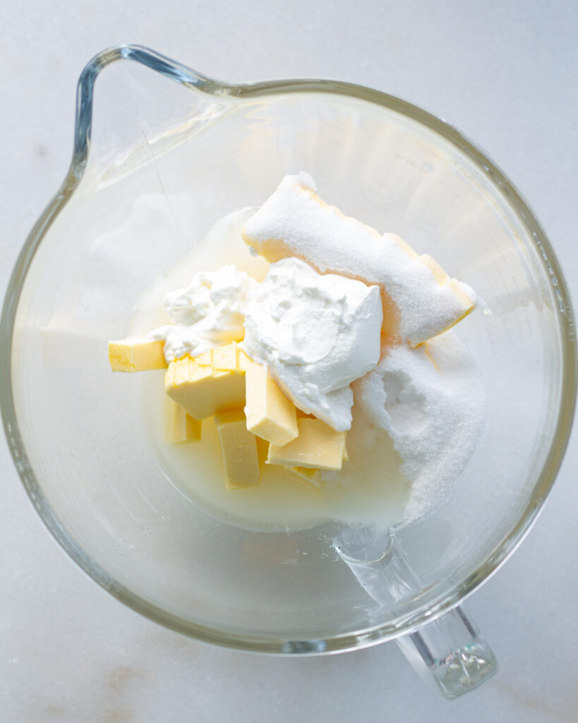 - In a stand mixer, add the butter, sugar, lemon juice, lemon extract and labneh. Mix on medium-high until light and fluffy.