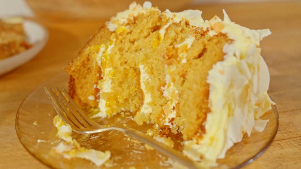 A tangy mango-yuzu curd – We all need a bit of acid to brighten up any sweet cake, and this curd is both tropical but sharp, making it the perfect balance in this coconut cake.