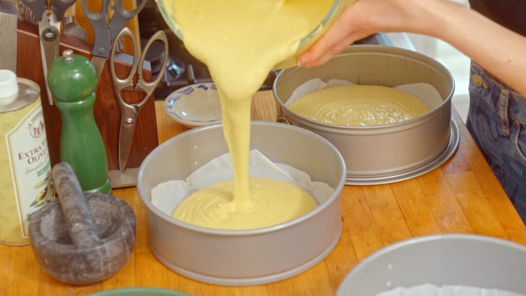 - Line four 9-inch cake pans with parchment paper. Evenly distribute the cake batter among them. Bake for 25-35 minutes, or until the cakes are golden on top.