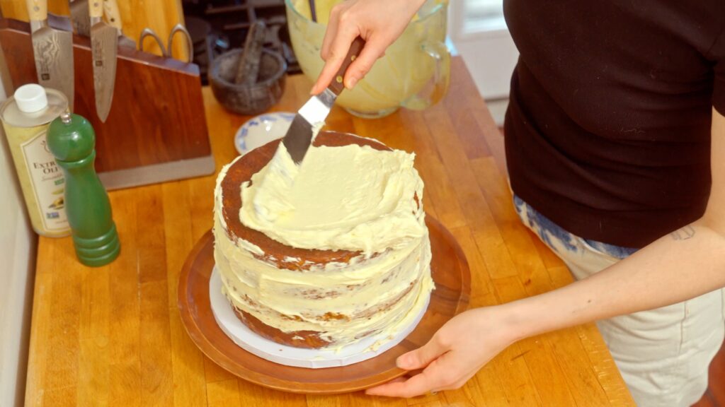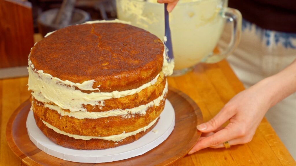 I suggest assembling your cake and then letting it chill for several hours (ideally overnight). Cold layers are sturdier and won’t shift around as you frost. Plus it gives the cake time to set. - Use a turntable (if you have one):