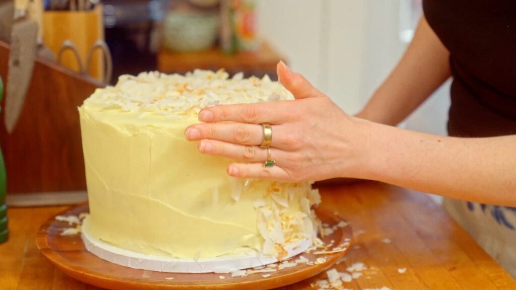 Tip: If you made this ahead of time and haven’t decorated it yet, you can keep the crumb-coated cake in the fridge for up to 2 days before finishing the frosting and coconut. I suggest 24 hours for peak freshness, but there is wiggle room!
