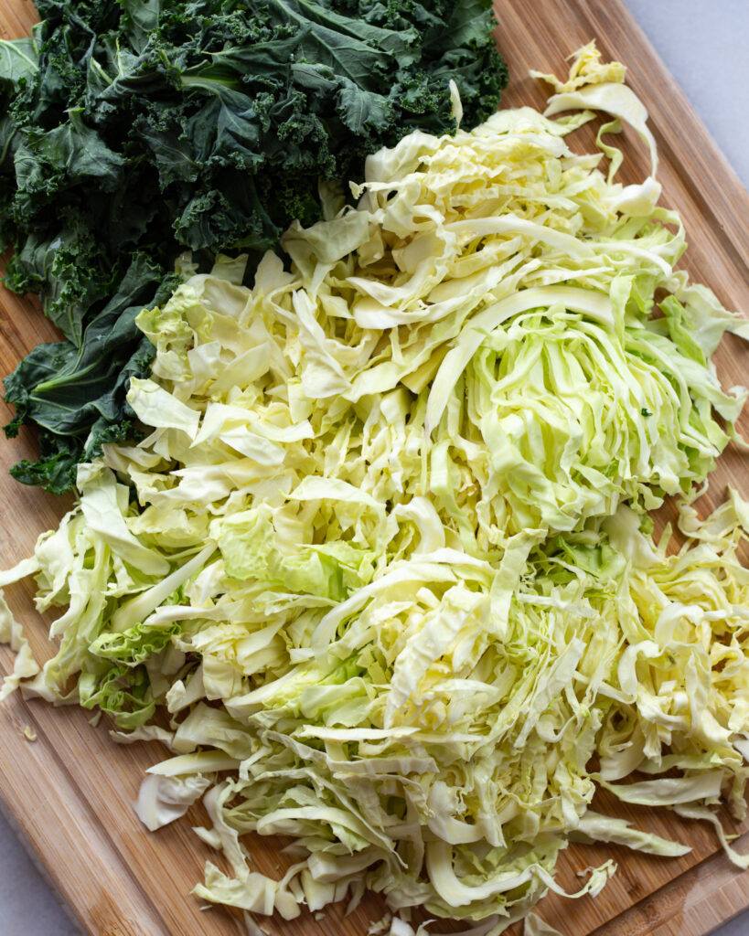 When your oven reaches temperature, put the cabbage in and roast until charred on the edges, around 18-22 minutes. Add the kale in during the last 8 minutes to roast.