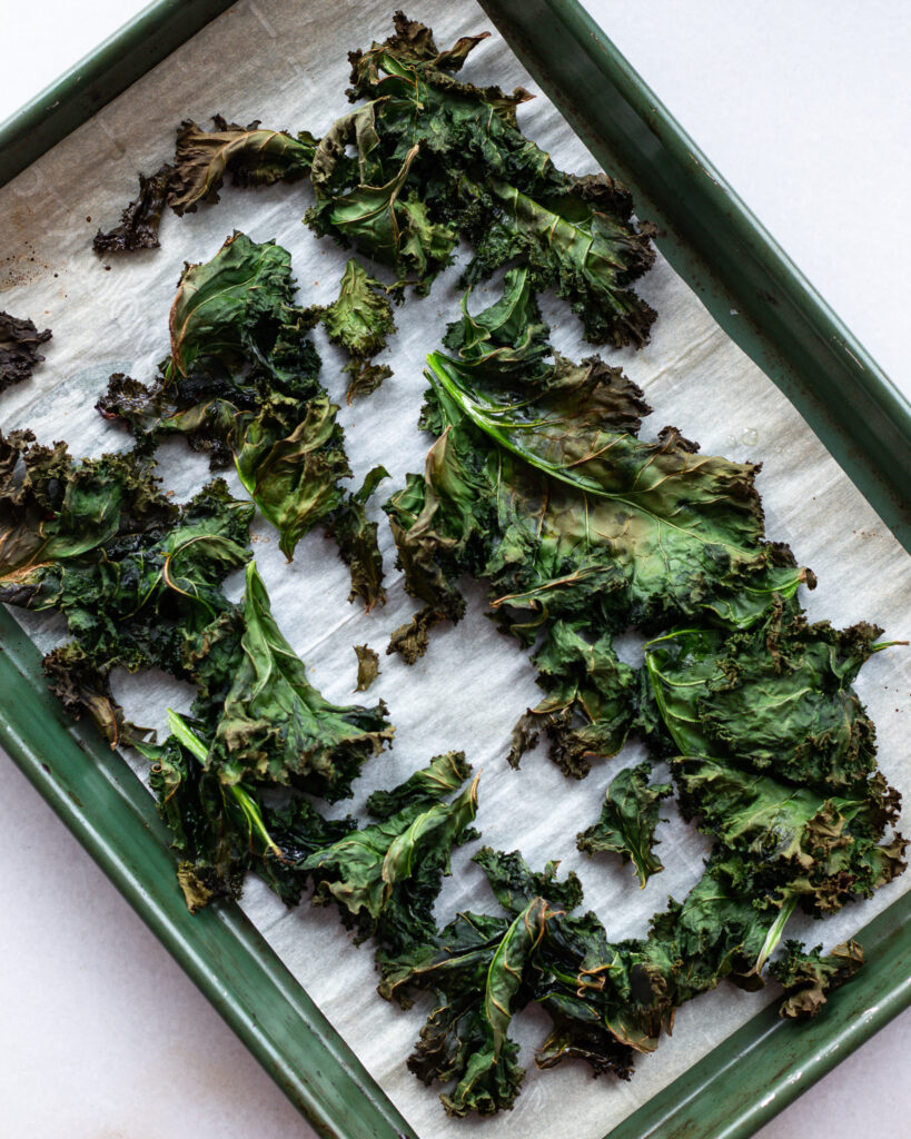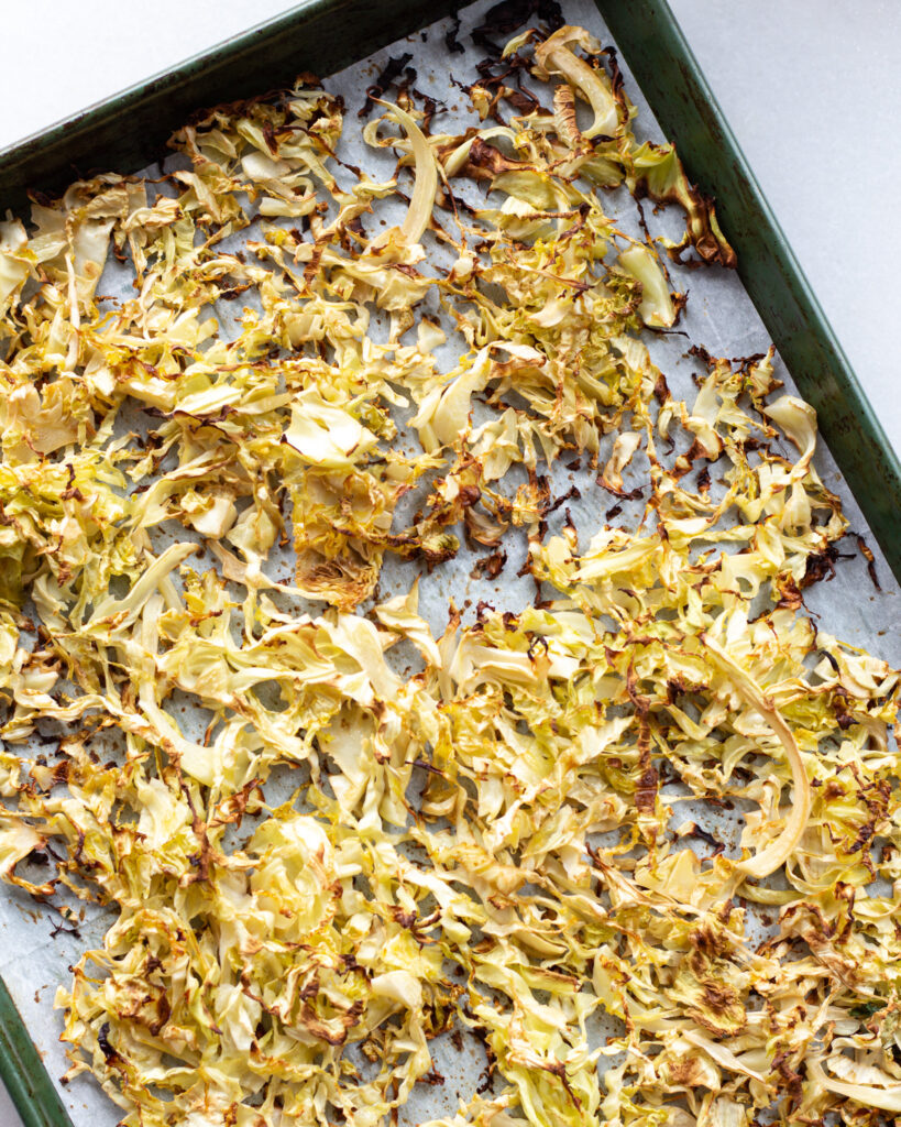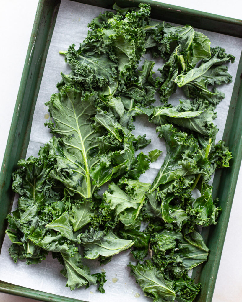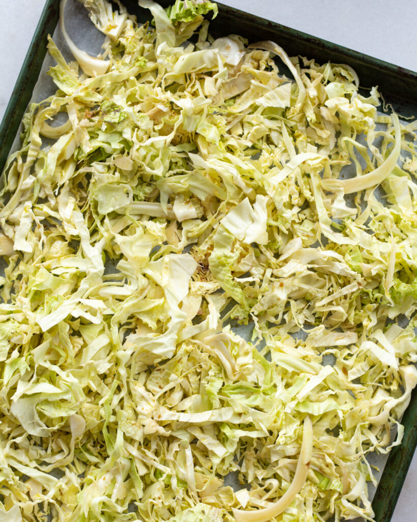 - Add the cabbage and kale to two parchment lined baking sheets. Drizzle with the Worcestershire and olive oil and toss to coat.