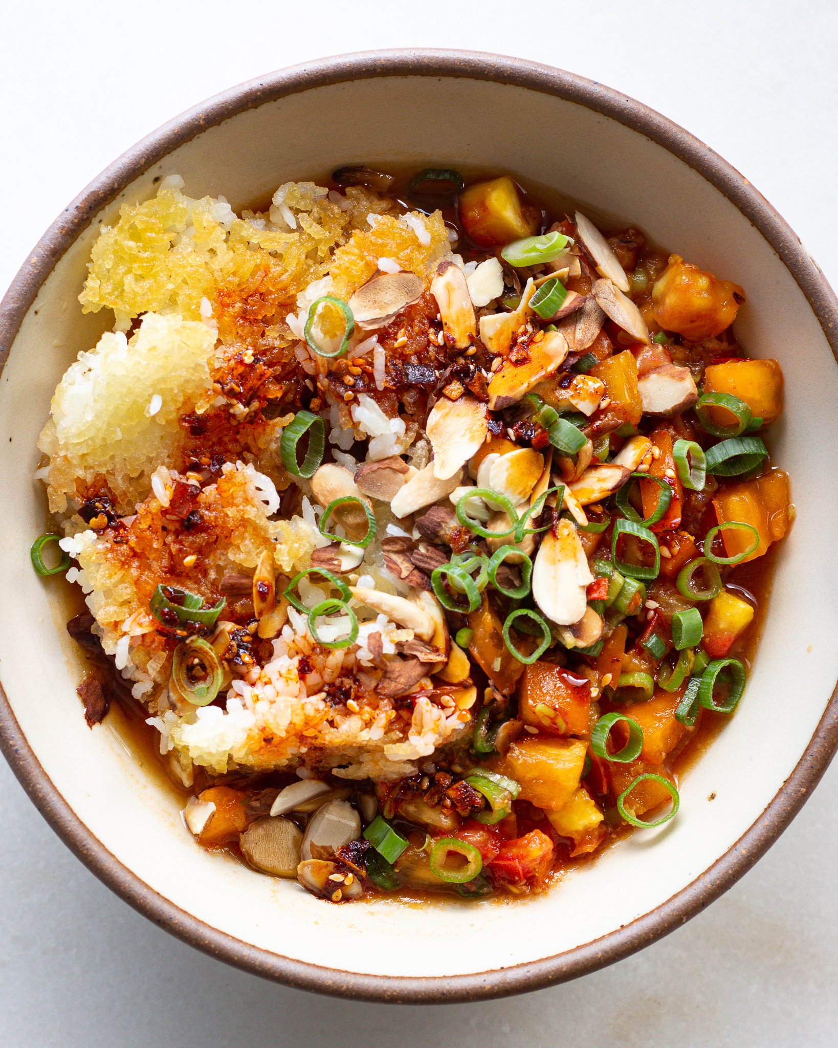 Since we are double-roasting this eggplant, first at a lower temperature and then in the broiler, I wanted the sauce to be thick enough to caramelize and sweet enough to get crisp. And that’s why kecap manis (sweet soy sauce) completely fit the bill.