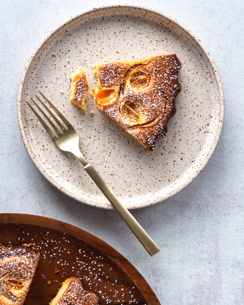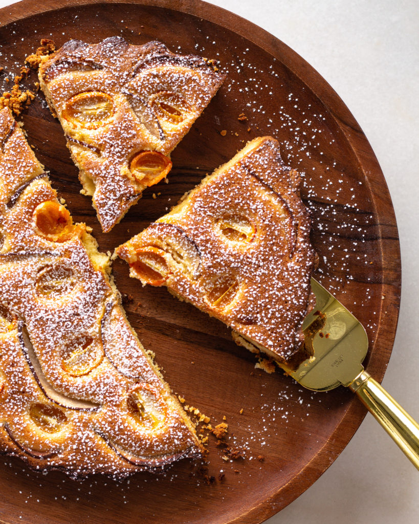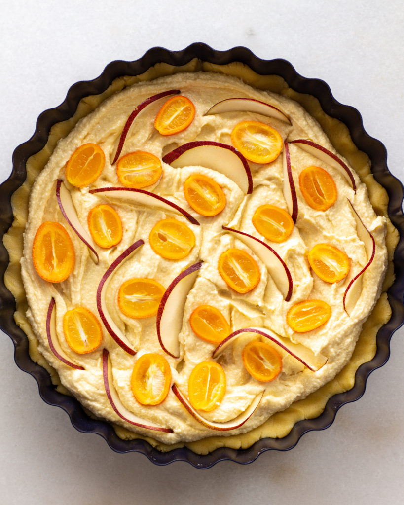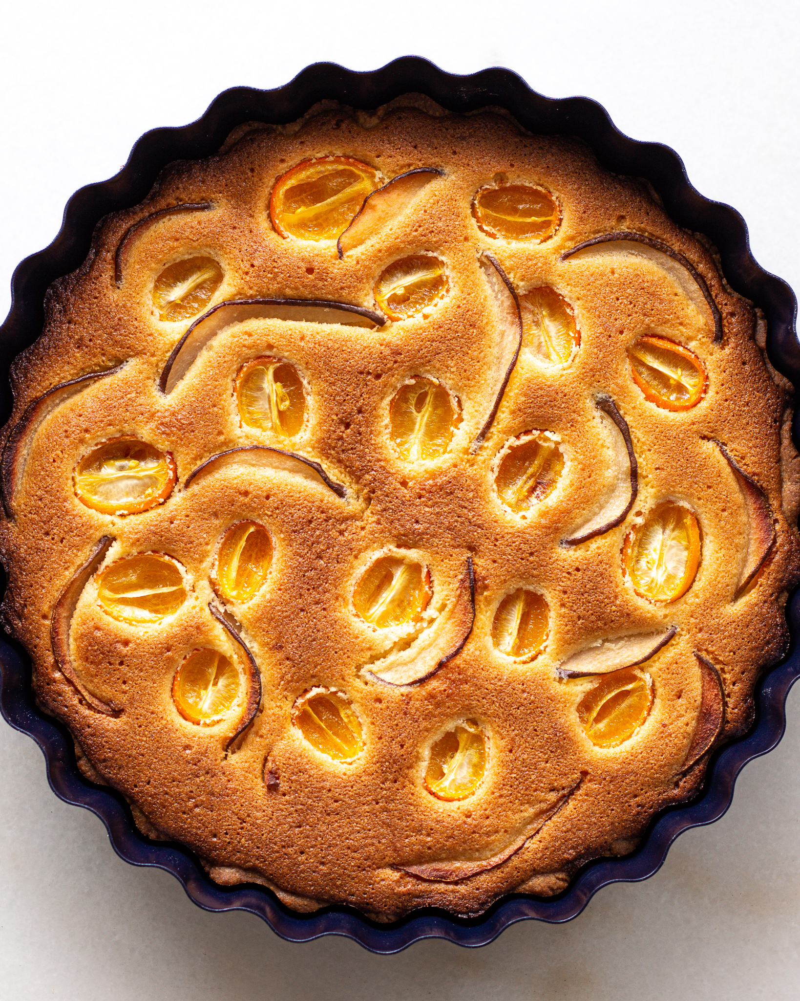 So to do justice to the classic, my version of gooey butter cake includes the powdered sugar topping, two layers of cake (one creamy and sweet, one dense and cakey), and of course all the butter. But in an attempt to elevate it just a bit, I made this gooey butter cake in tart form, added some kumquats and pears for complexity and flavor, and made it a bit simpler with the base ingredients.