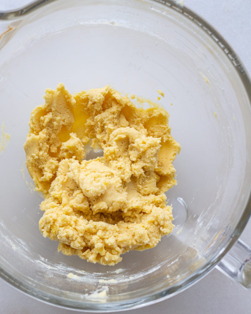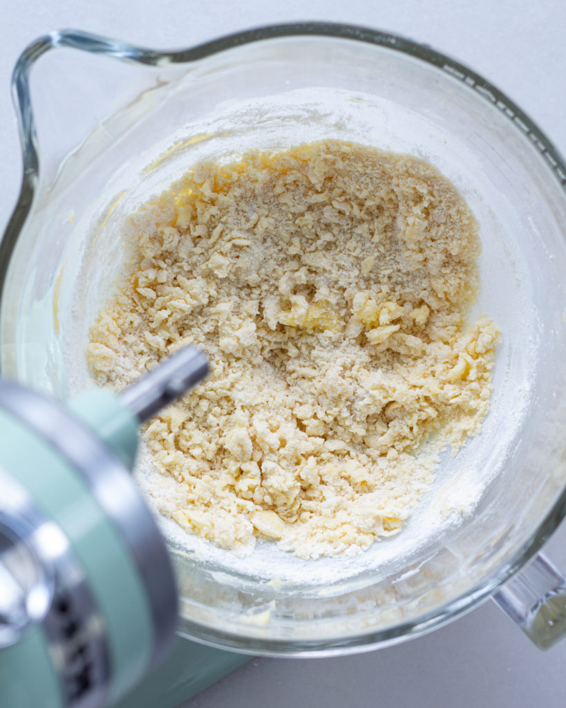 Start by creaming together the butter and sugar in your stand mixer, then add in the flour and mix until it is a crumbly mixture (see above)