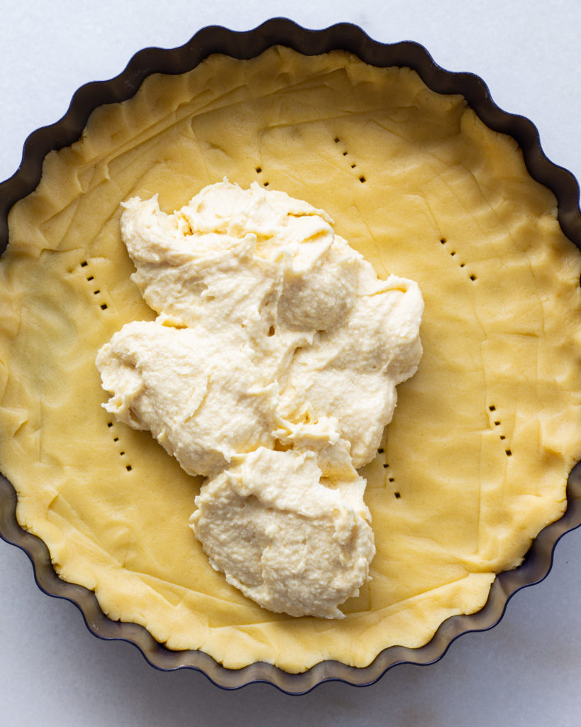 - Grab a 9" tart pan or cake tin and place the tart dough inside. Use your hands or the back of a wooden spoon to press the dough all the way to the edges.