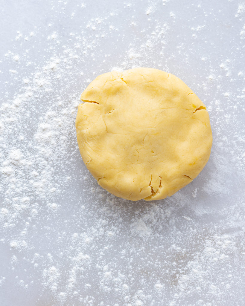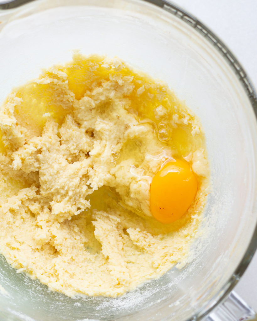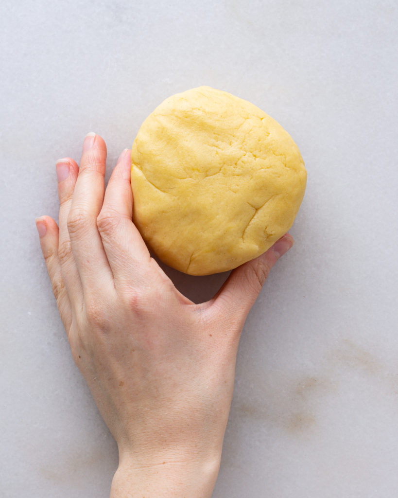 When you reach that texture, add the egg yolk and watch magic start to happen. After about 30 seconds of mixing, the dough magically comes together into a thick, play-dough like texture. It’s firm, buttery and super easy to work with.
