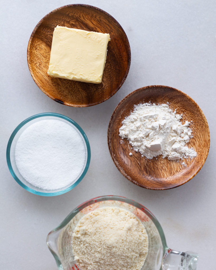 Normally gooey butter cake includes a boxed cake mix of some kind, but this one just includes butter (of course), sugar, eggs, flour, almond flour, salt, and vanilla extract.