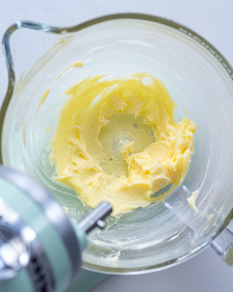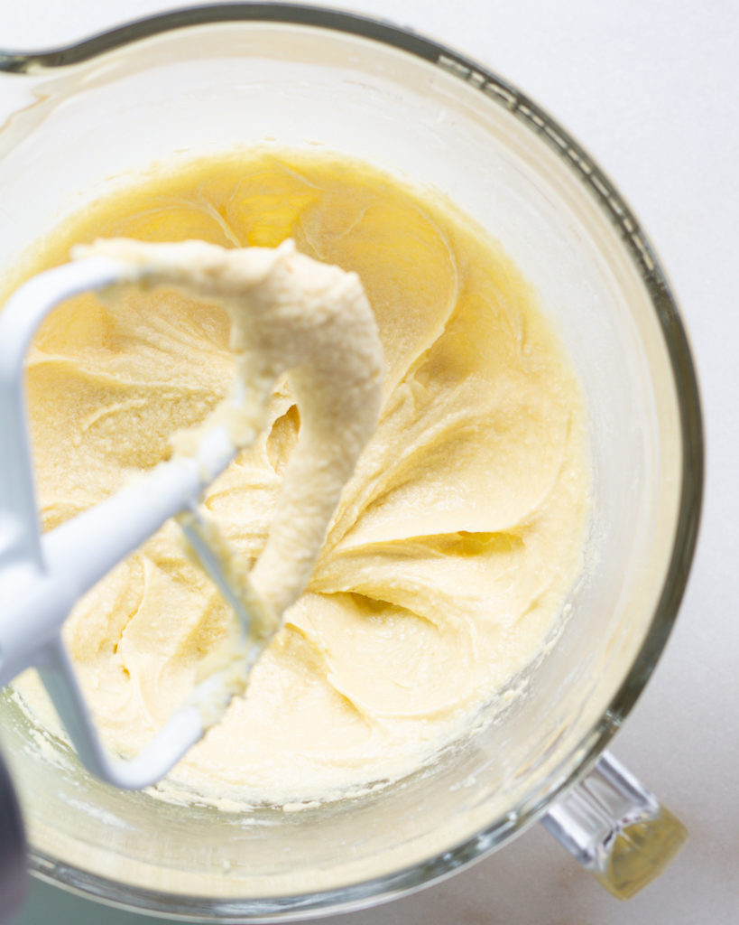 The beauty of this topping is that it comes out pretty smooth and gorgeous every time, and you don’t need to tend to the mixer too much. Just add the butter and sugar first, cream that very well and then add in the almond flour.