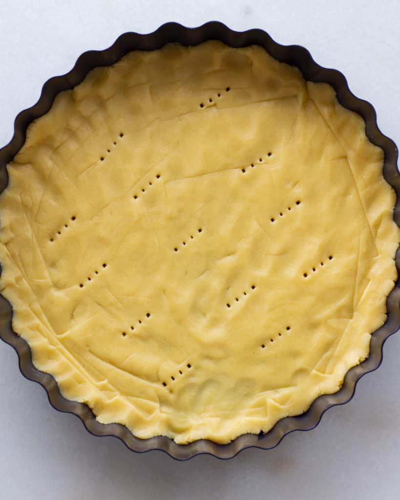 - When the dough fully covers the bottom of the tart pan, prick it a few times with a fork.