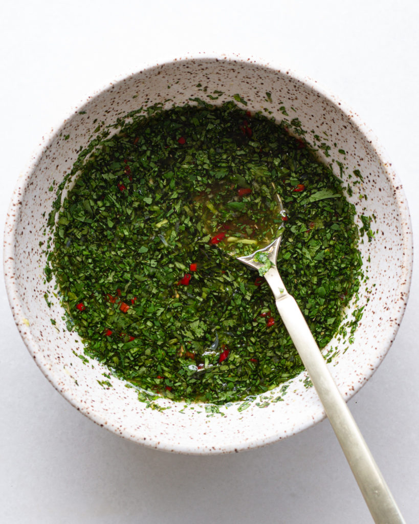 - Add in the cilantro, chilies, garlic and ginger and whisk again. Add more rice vinegar if the sauce needs to thin out a bit more. Set this aside, it gets better as the ingredients meld together.