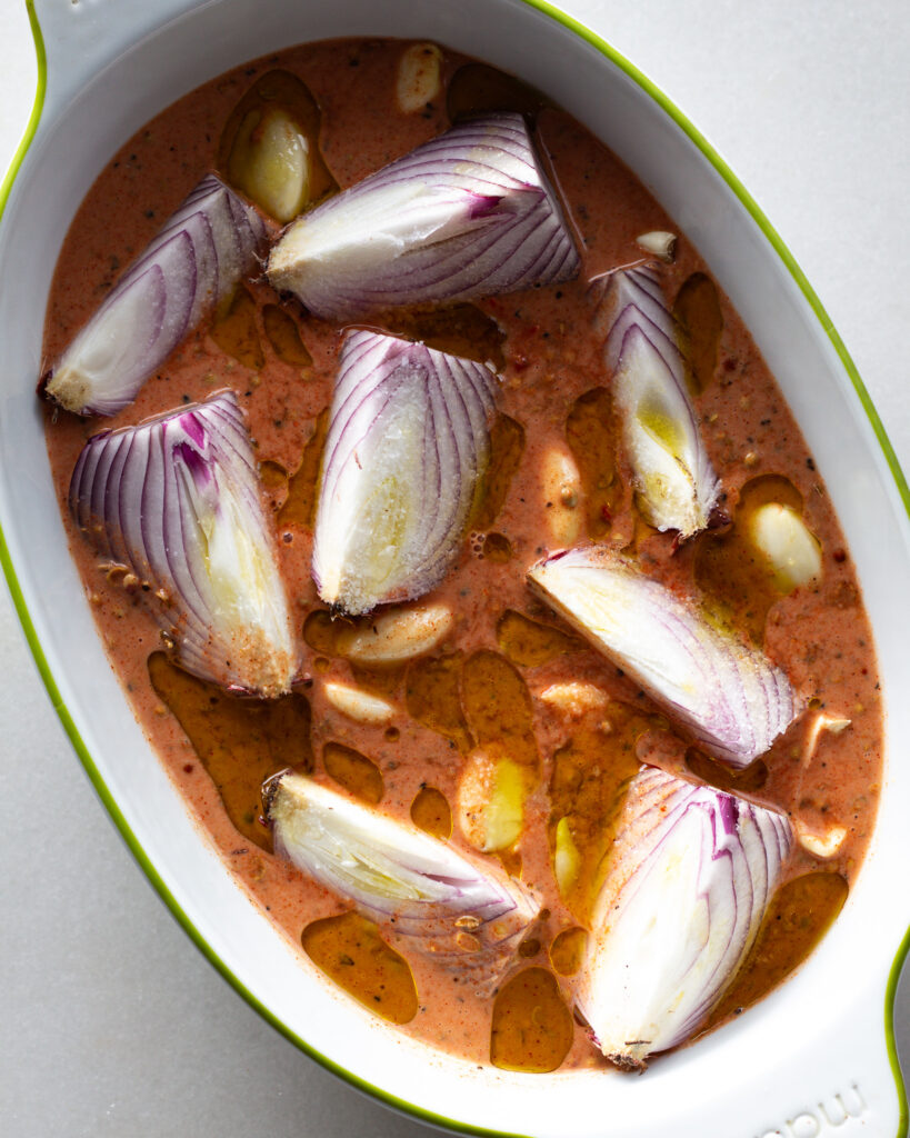 It’s so easy to start this recipe. Just add the garlic and onion to a high-sided baking dish, then whisk together all the spices, tomato paste and coconut milk and pour that over the top of the garlic and onion.