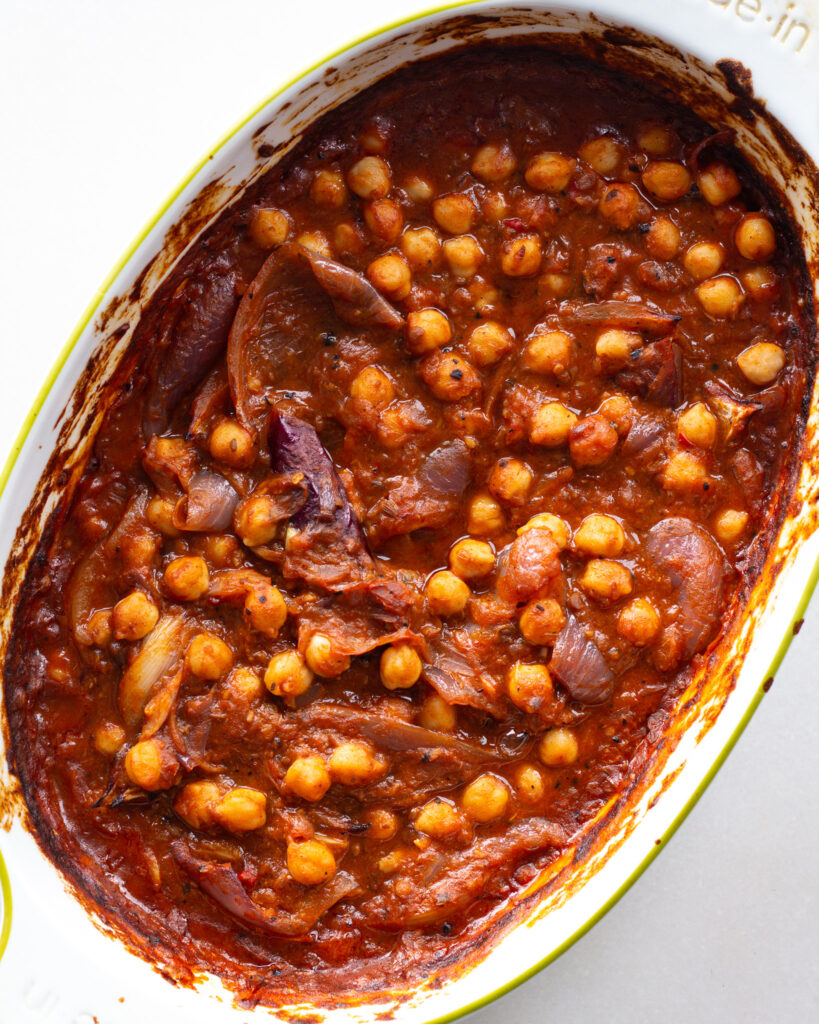 BUT ANYWAYS, this recipe is oven-only, supremely easy, and fully plant-based. It’s great for meal prep (it makes four servings!) and is even better for an easy weeknight dinner that you’ll want to assemble and then not think too much about. It’s packed with flavor, has just a hint of spice, and is filling enough to keep you running for days. I like to only use one can of chickpeas if I’m feeling like I want a heavier sauce, but I easily switch to two if I want to bulk it up a bit more. It’s customizable! I’ll talk more about this oven-only dinner in the blog post, so read on for how best to make it.