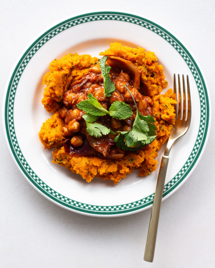 - To serve, put a large scoop of carrot mash on a plate, then top with a generous scoop of the chickpeas. Garnish with more herbs and eat!