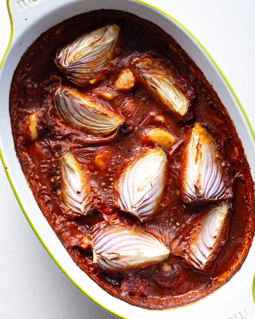 - When the chili and red onion mixture is out of the oven, scoop up the garlic cloves, four of the onion quarters and a bit of the liquid and add it into a food processor. Process for 15 seconds or until you have a chunky but broken-down mixture. Add this back to the baking dish, and mix and break up the remaining onion pieces so that there are red onion slices throughout.