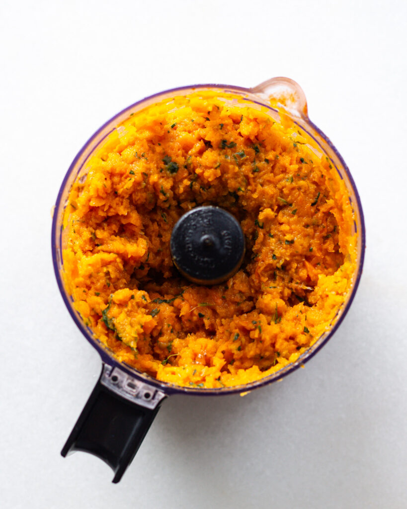 The food processor is our FRIEND in this recipe. I always recommend getting a small one, since they are way less of a hassle to clean than a big one. If you are in a pinch, a blender works fine here, too.