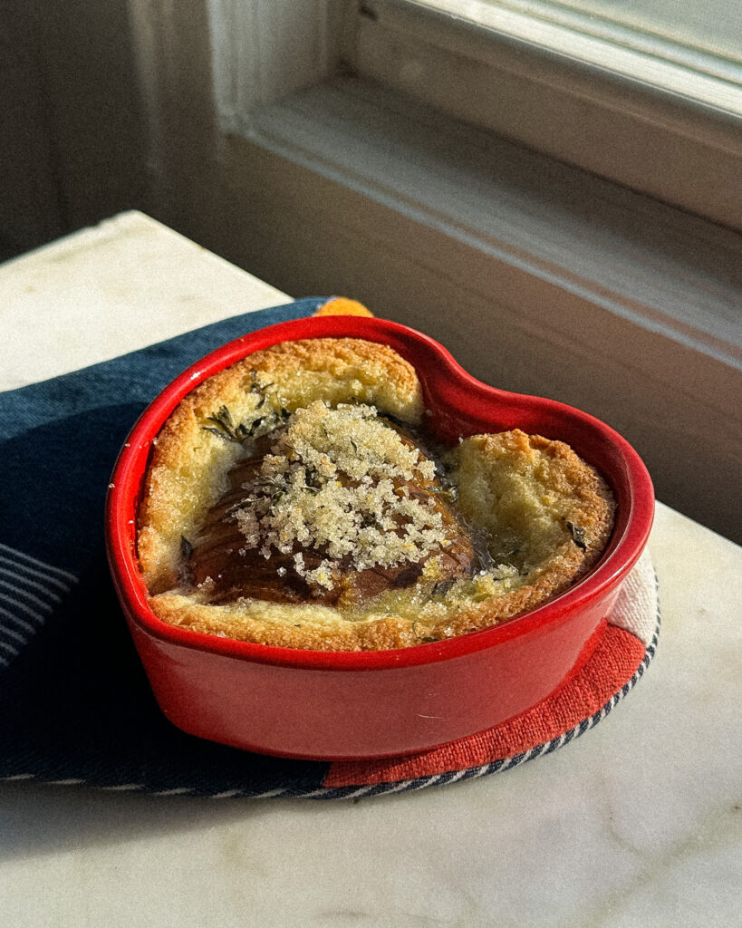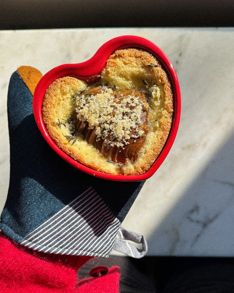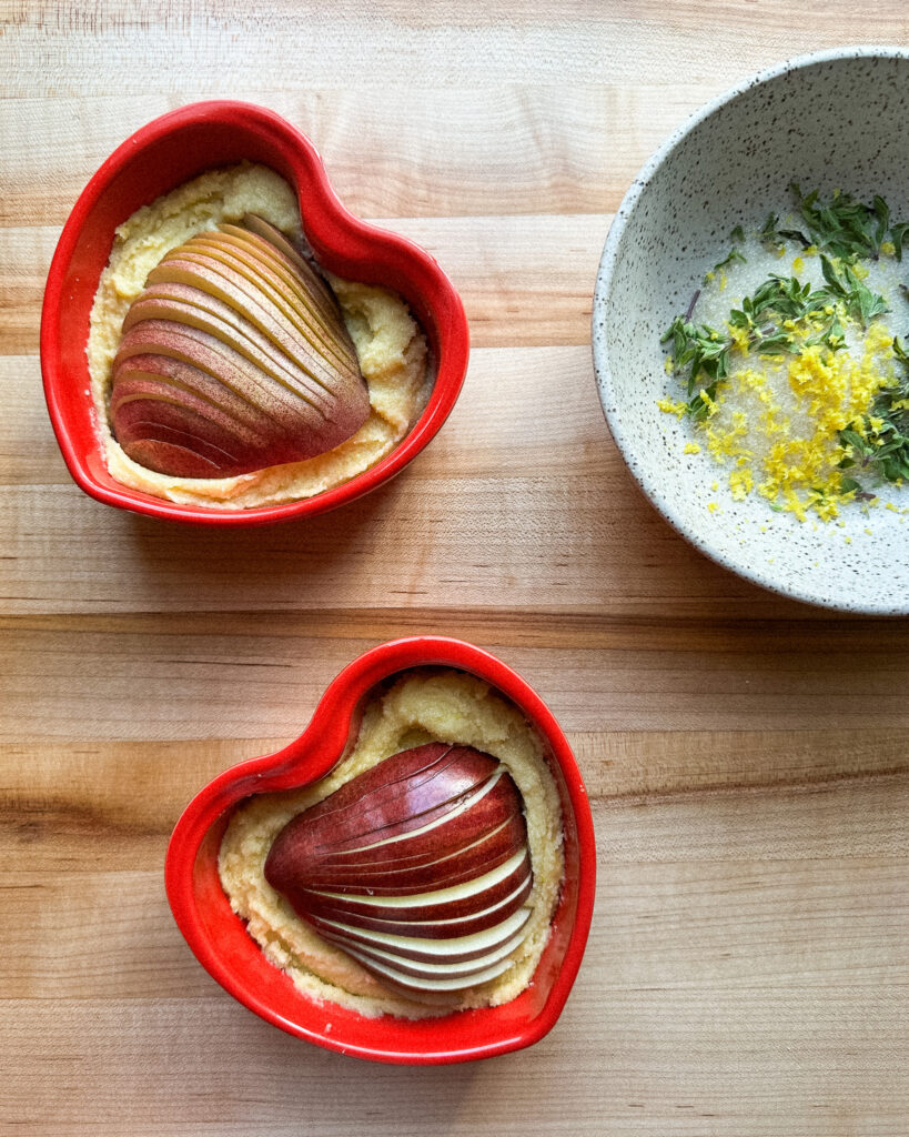 This recipe is a cute little Valentine’s Day recipe for when you are short on time but want something adorable, delicious and packed with flavor. Pears in Frangipane (or any fruit in frangipane!) is one of my favorite things to make, and eating straight baked frangipane is a surprisingly delightful experience. This Pears in Frangipane recipe balances the buttery richness of the French almond cream with a lemon thyme sugar. The sugar gets all toasted on top and the pears stay all jammy, making this the perfect sink-your-spoon-into-it dessert!