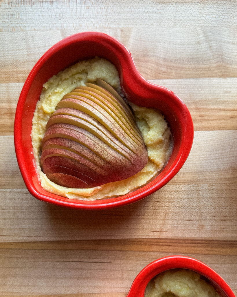 - Halve and core the pear. Remove the stem. Slice down the side of the pear, but don’t slice into the top, creating a line of thin pieces that can fan out while still being in one piece. Press each pear half gently into the frangipane ramekins, one half per ramekin.