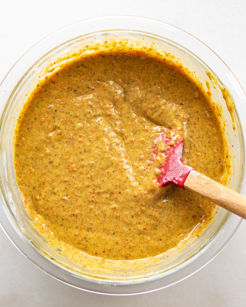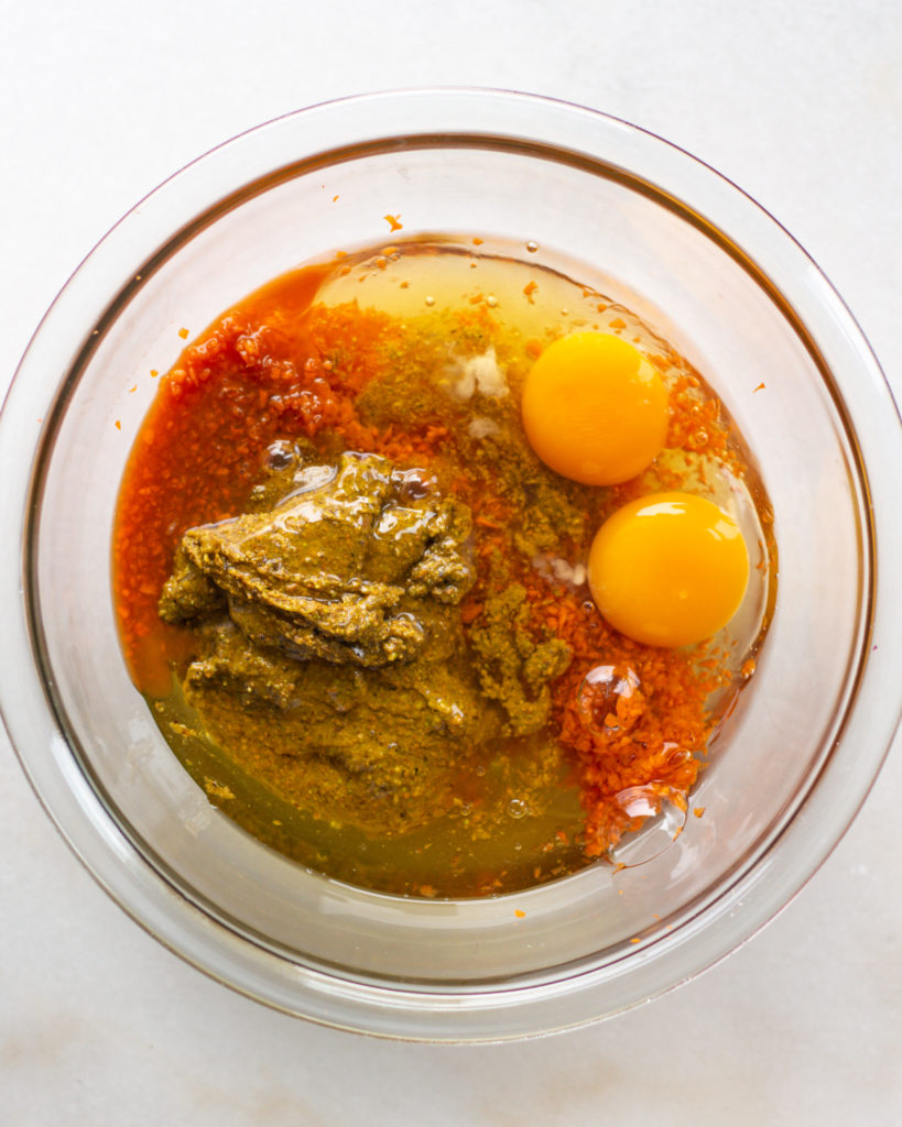 - In a larger bowl, whisk together the carrots, eggs, pistachio butter, and honey