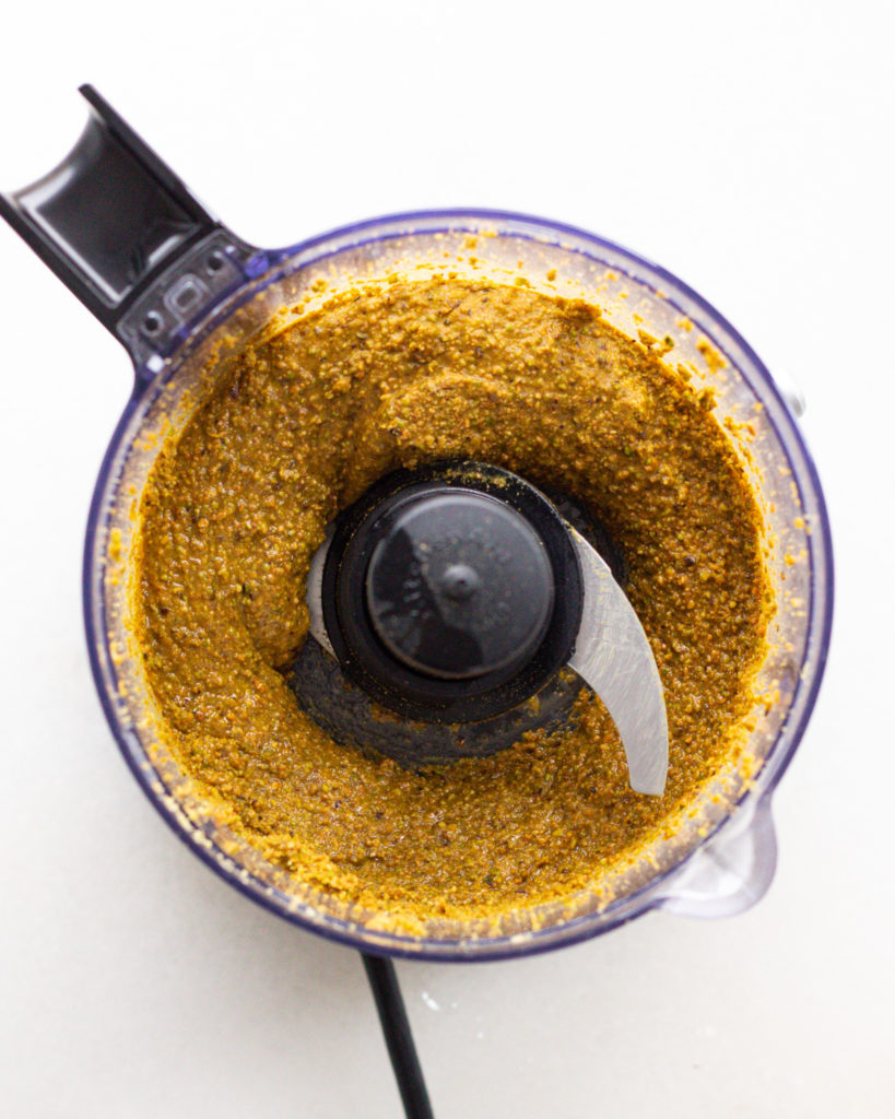 - Pulse 1 cup (150 grams) of pistachios with 2-3 tbsp of olive oil in a food processor. Add a pinch of salt and then blend until smooth and drizzly.