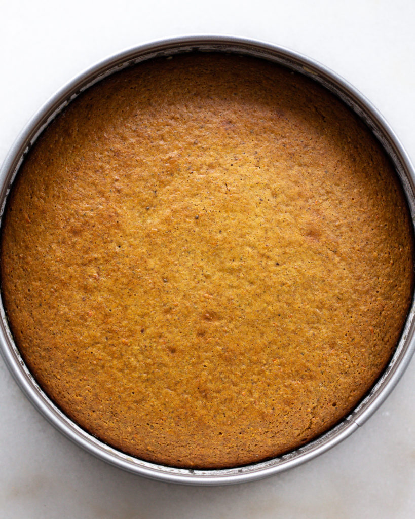 I like to grate my carrots in the food processor, but you can also do it with a handheld grater. The key is to avoid grating the pieces too big (and please PLEASE don’t use store-bought), because the smaller pieces maximize the moisture in this pistachio carrot cake.