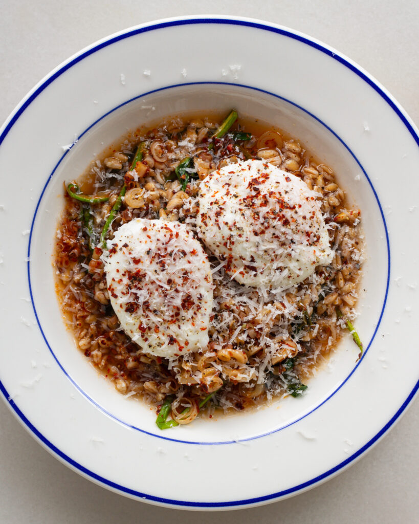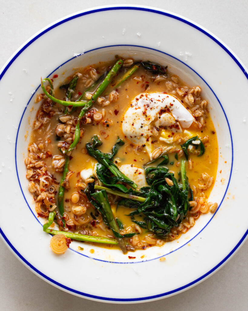 - To plate, add a scoop of the asparagus and ramp leaves to a bowl, top with the farro, then pour the hot chili ramp broth over top. Nestle in the two eggs and grate on more black pepper. Finish with freshly grated parmesan, and enjoy.