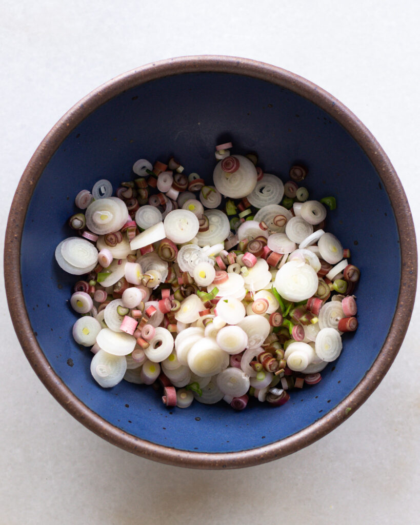 It is a very simple recipe, but that’s to celebrate the flavor of the ramps. Ramps are wild garlic, you can only forage for them, instead of actually farm and harvest. It’s why when they come about this time of year, it makes them all the more special. Ramps are typically seen as an addition to a meal, say in a pesto or sauce, but my favorite way to eat them is to eat them whole. This bowl harnesses their subtle, garlicky flavor and really pulls it to the forefront. The chili is there to just pack some heat, and the egg adds some much-welcomed protein and richness.
