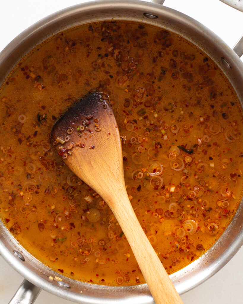 This recipe comes down to timing. I start with the farro first, and while that is cooking, I work on the cooking of the ramp stems and asparagus, then the chili ramp broth. This recipe works best if you are working on two burners side-by-side, but you can also do everything one at a time, which is how the recipe is outlined. Here’s the full step-by-step breakdown: