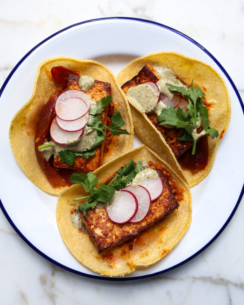 Now because I’m me, I turned to tofu, which might sound unconventional, but it’s actually a really nice protein base. When seared, tofu develops a golden crust and really drinks in the flavors of its marinades. Here, it gets marinated in a quick homemade pozole rojo-style sauce before being pan-seared until caramelized and smoky.