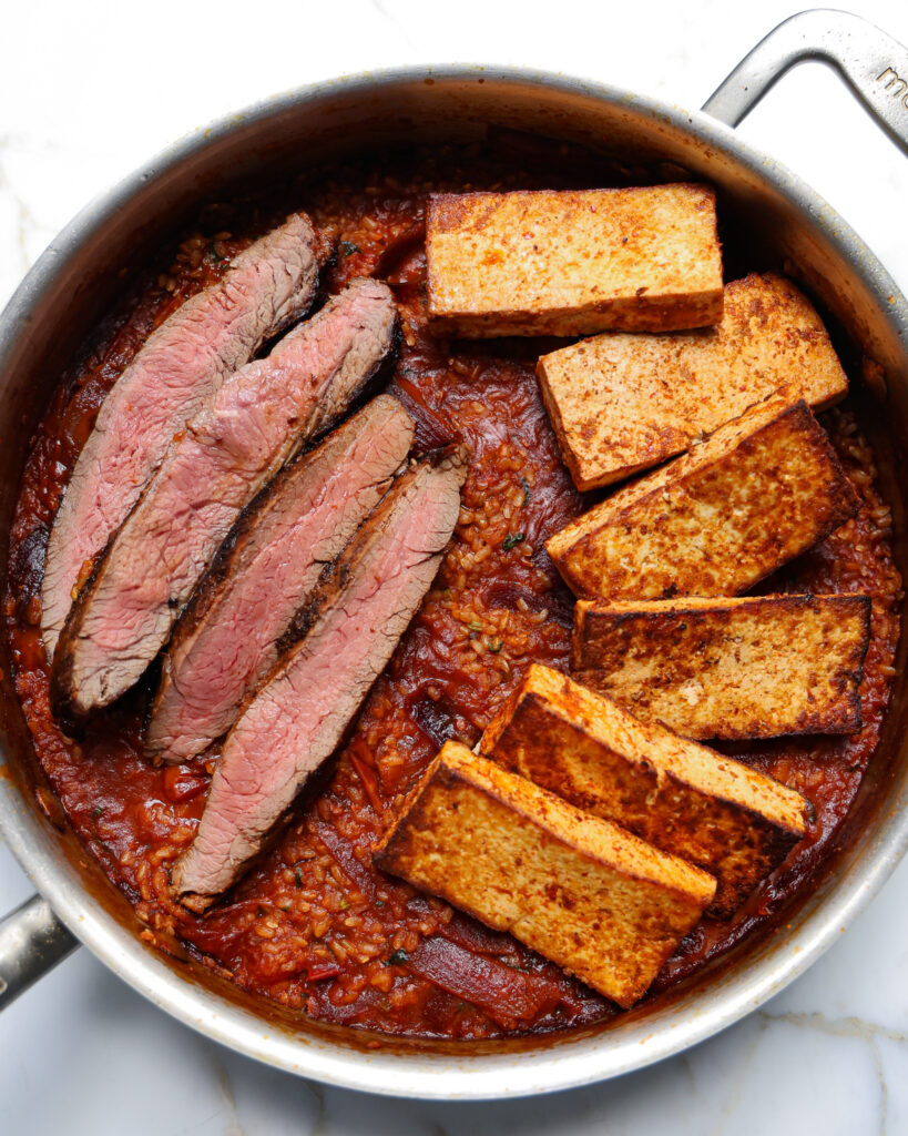 This Pozole Rojo-Inspired Tofu and Rice has everything you love about the traditional dish, smoky dried chilies, cumin, Mexican oregano, and a bit of acid from the tomatoes, but instead of pork and hominy in a brothy braised stew, we’re using crispy tofu, nutty brown rice, and sautéed vegetables that soak up all that chili-rich sauce. Think of it as a hybrid between a rice bowl, taco filling, and stew, and it’s absolutely packed with flavor.