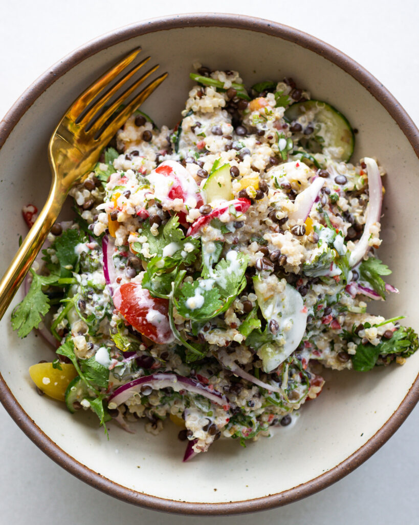 I have a few salad-building rules I find helpful, especially when I’m looking to make the best quinoa lentil grain bowl out there. Here are my rules to live by, which I hope this recipe covers: