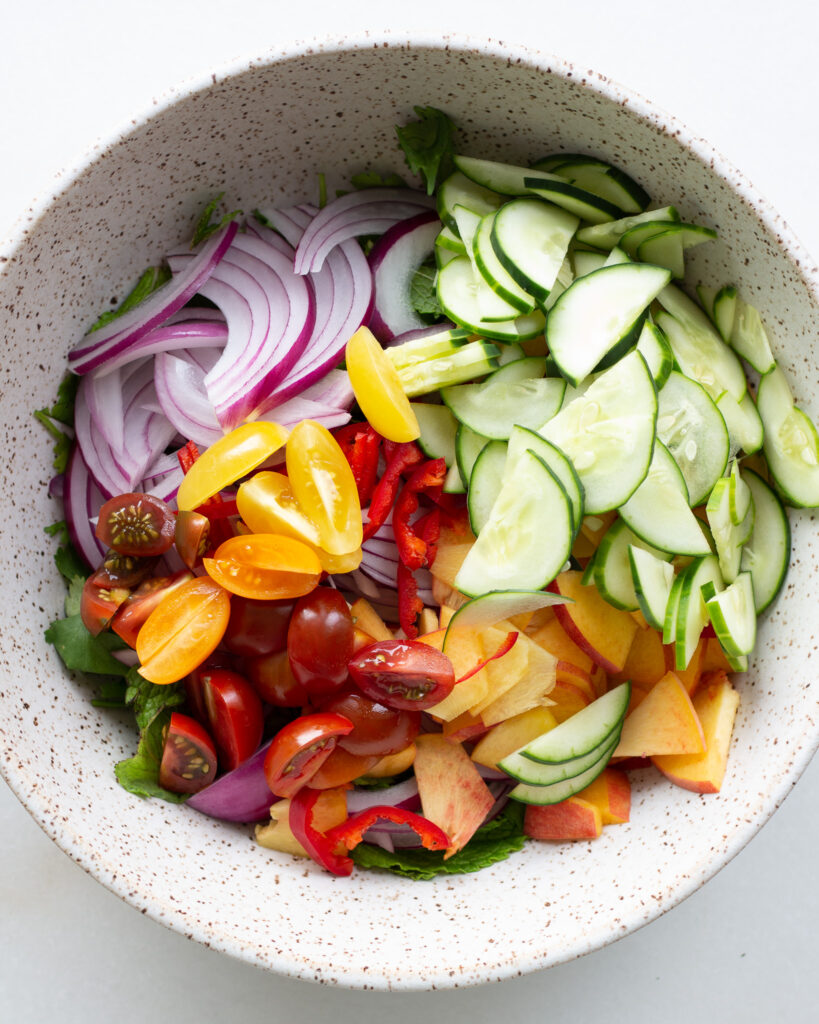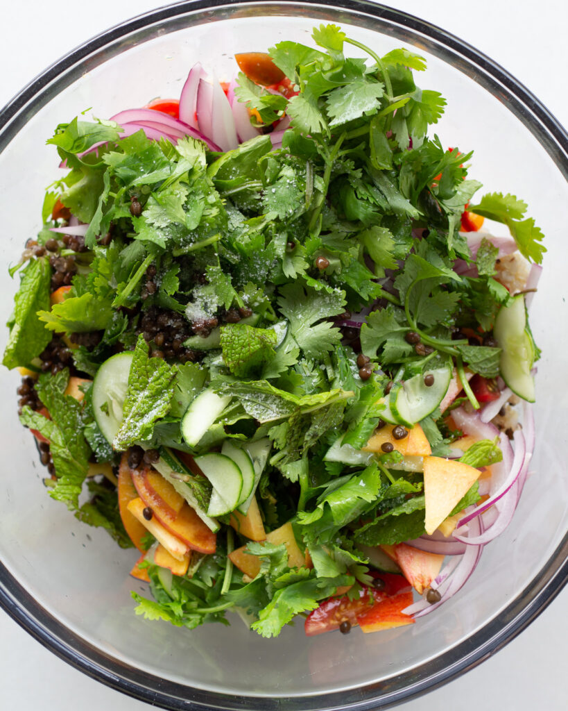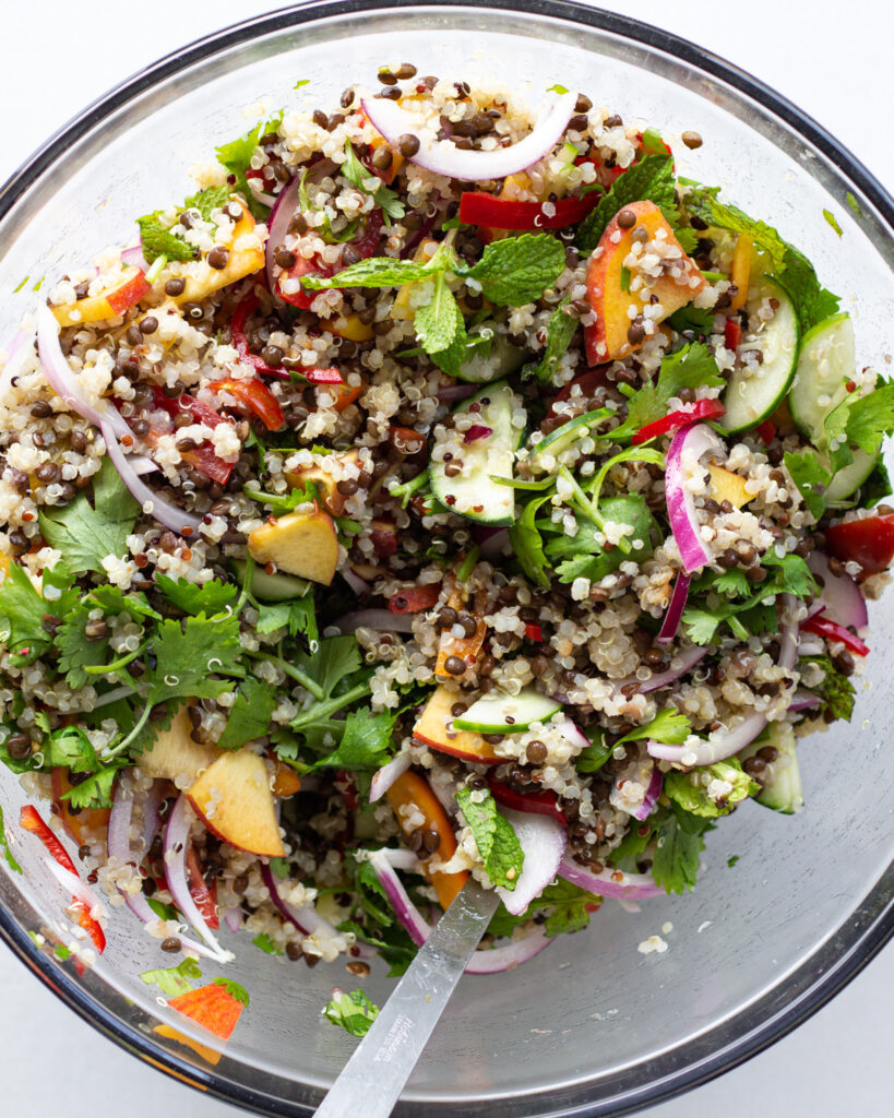 - Assemble the salad. Tear the remaining mint and cilantro and slice the remaining half of the Fresno pepper and add them to a large bowl. Add 1/2 red onion, 1 pint of cherry tomatoes, 1 peach, 1 cucumber and the chilled lentils and quinoa. Give a few big mixes and season with salt and 2 tablespoons of white wine vinegar. Add about half the dressing and mix again.