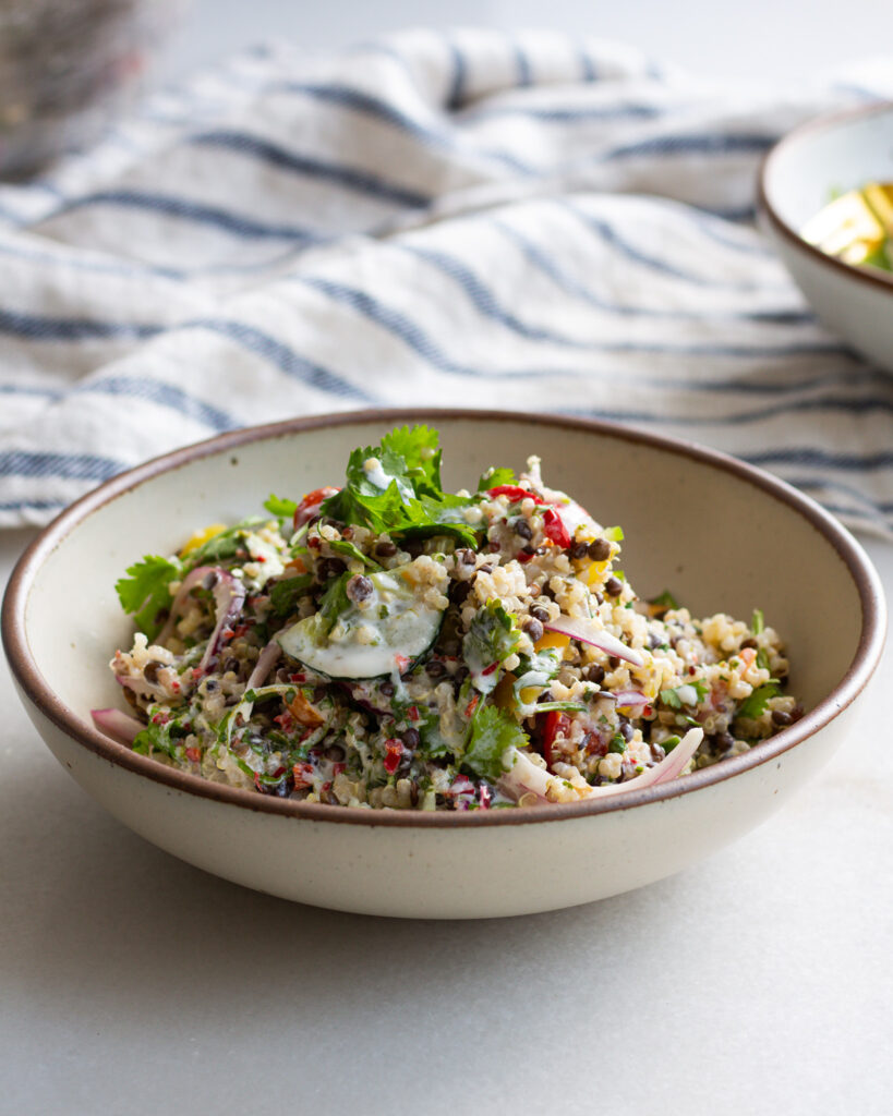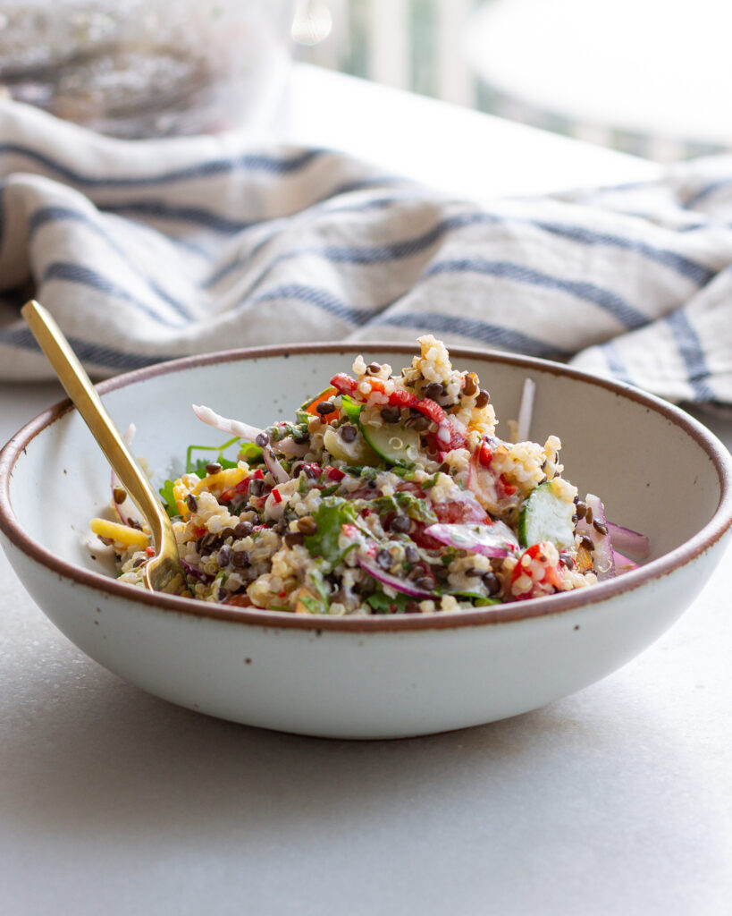 What I love about this recipe is that it’s easy to store. The quinoa absorbs all the flavor from the dressing, so it just gets better as it sits. The lentils are nice and perky since we avoid cooking them into oblivion, which means they keep well in the fridge as well.