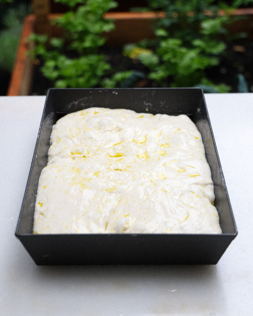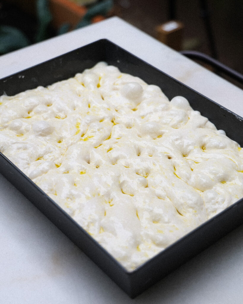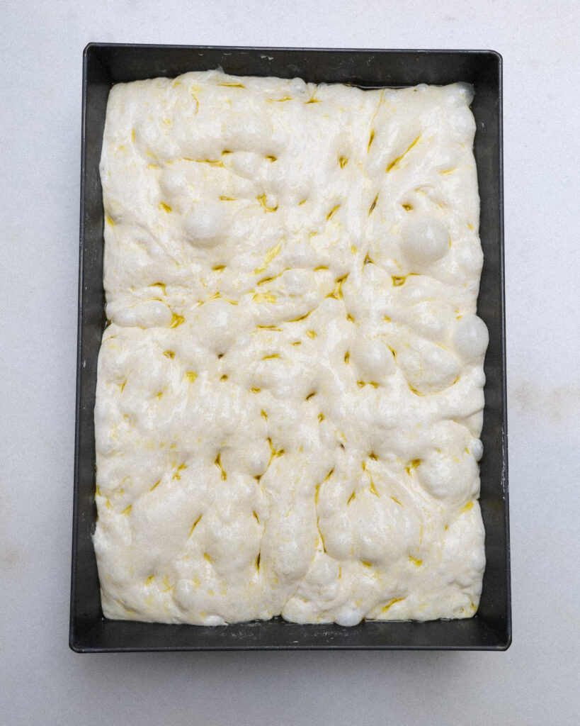 Overnight the focaccia will relax into the image you see above. It might seem ready to go, but give it one more shape and you’ll have the most beautiful focaccia result you’ve ever seen!