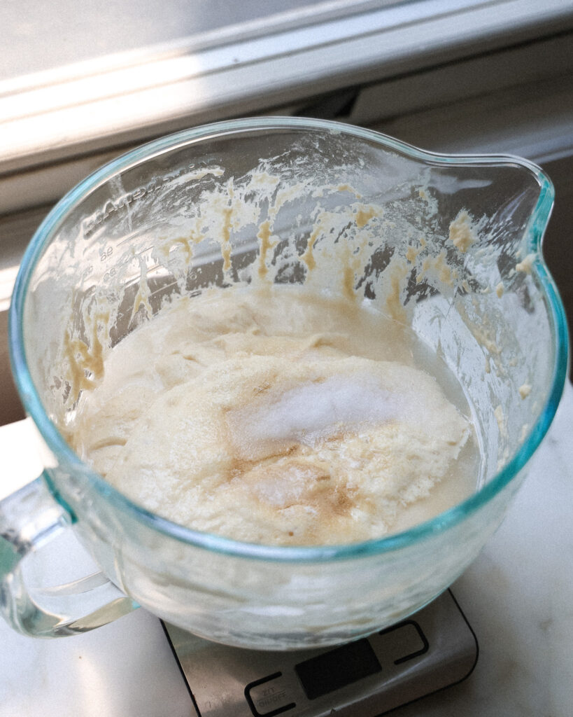 Let this sit, then to the bowl I like to add a tiny amount of yeast, the activated sourdough starter, salt and sugar. The yeast technically makes this an improper sourdough, but I’ve found the bread is so much better with it added.