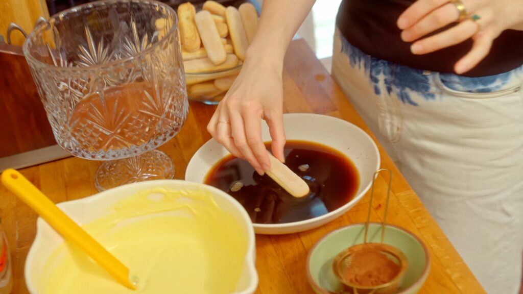 Tip: Don’t dip your lady fingers for too long, they really only need less than a second. I made the mistake of dipping them and lingering, and it left me with a soggy, runny tiramisu layer, and no one wants that.