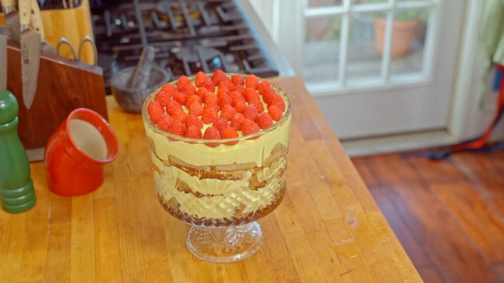 Let the tiramisu rest in the fridge for at least 4 hours to set. When ready to serve, scatter raspberries across the top and dive in.
