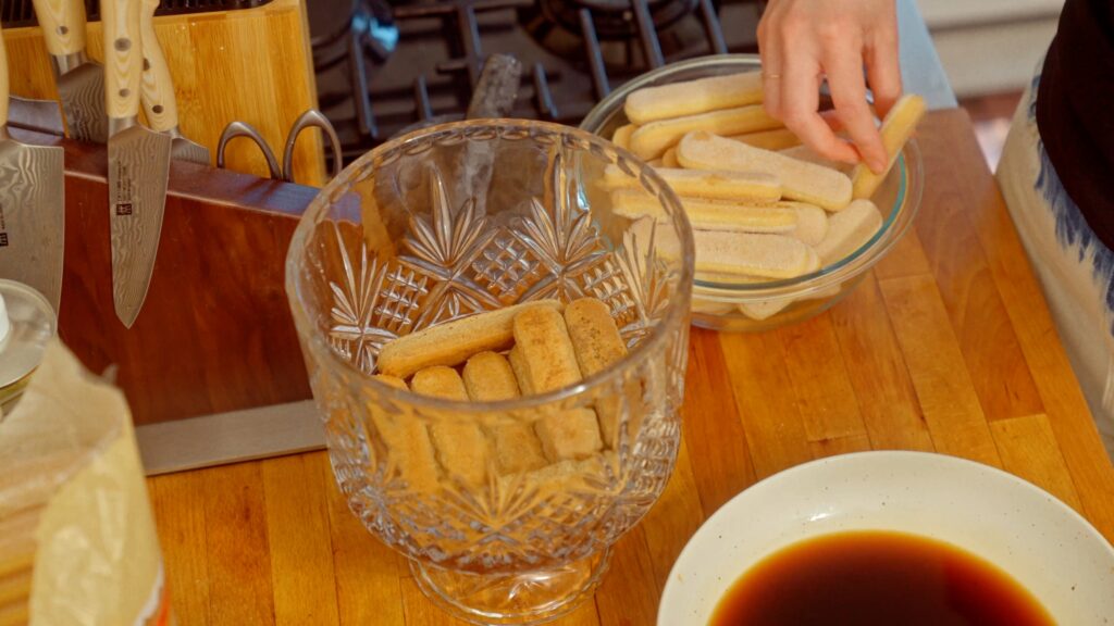 - Dip each lady finger in the espresso for just a second, then layer them into an even layer at the bottom of the dish. I like to double layer them so that you can see the layer from the side of the trifle dish, but that's personal preference.
