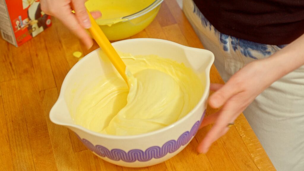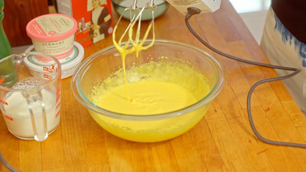 Fold the whipped yolk mixture into the cream mixture. The result should be smooth, rich, and thick—almost like a dessert custard.