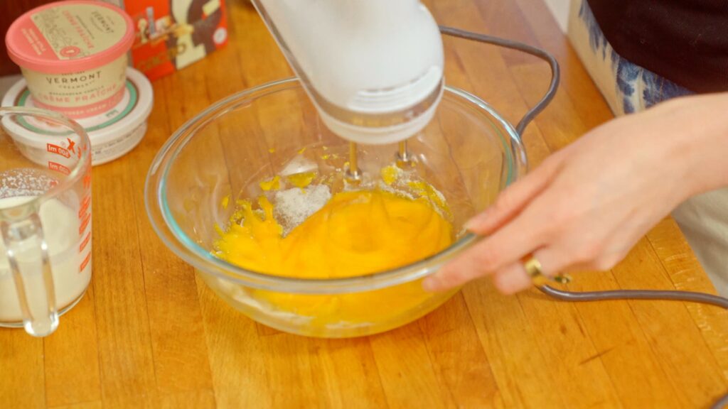 Whip the egg yolks and half the sugar until pale, thick, and voluminous. You want it to be about triple the size, see image below.