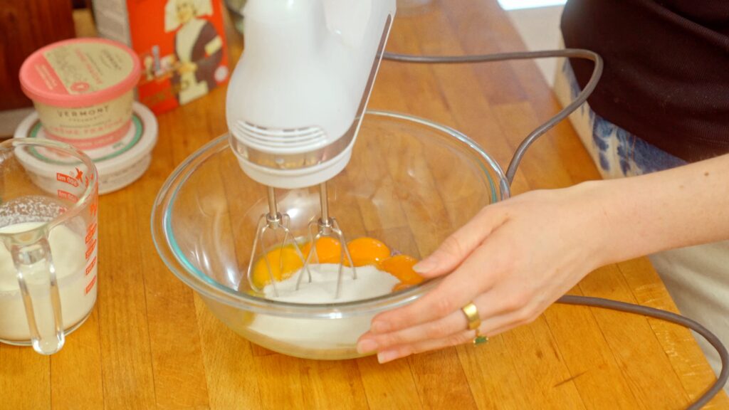 - Using an electric mixer in a large bowl, whip together 8 egg yolks and 100 grams of granulated sugar until the color turns from orange to pale yellow and the eggs are about double to three times the size. Set this aside.