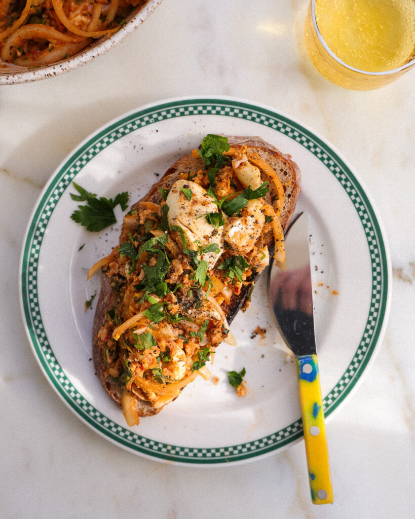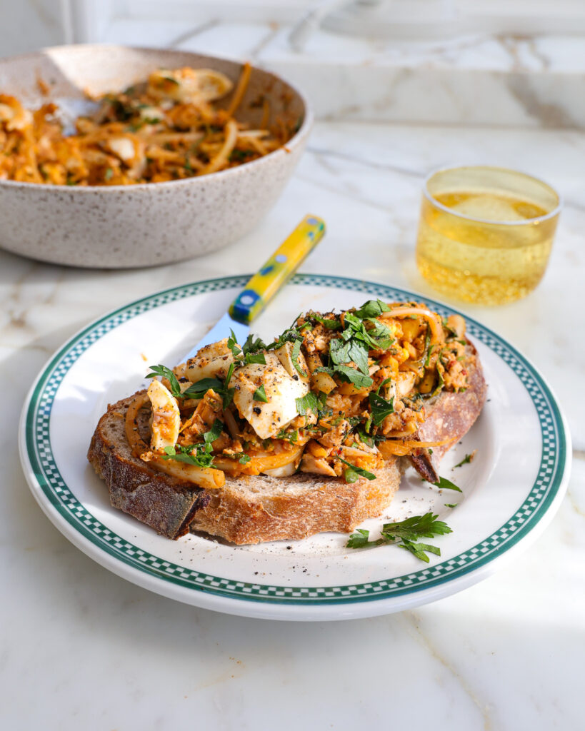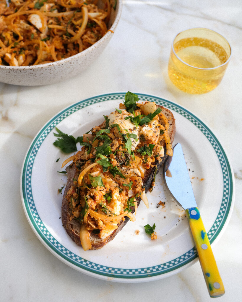 I didn’t have most of the ingredients listed, but wanted to make something as close as possible, so I improvised…I used a sun-dried tomato along with some of the olive oil from the container, sprinkled on some paprika, oregano, garlic powder, cumin, chili powder and dill, plus a garlic glove. I cooked it over low heat while I boiled one egg, then mashed with a fork and added some skyr, lemon juice and a splash of water to thin. Added a bit of kimchi, about 3/4 of a 5 ounce can of tuna, then cut in the egg. I put it on some fresh sourdough, then added salt and pepper on top, plus some mint. Overall, not very close to Justine’s, but very influenced by it 😅 The end result was SO. GOOD! I’ll have to make this correctly sometime, haha! Thank you!
