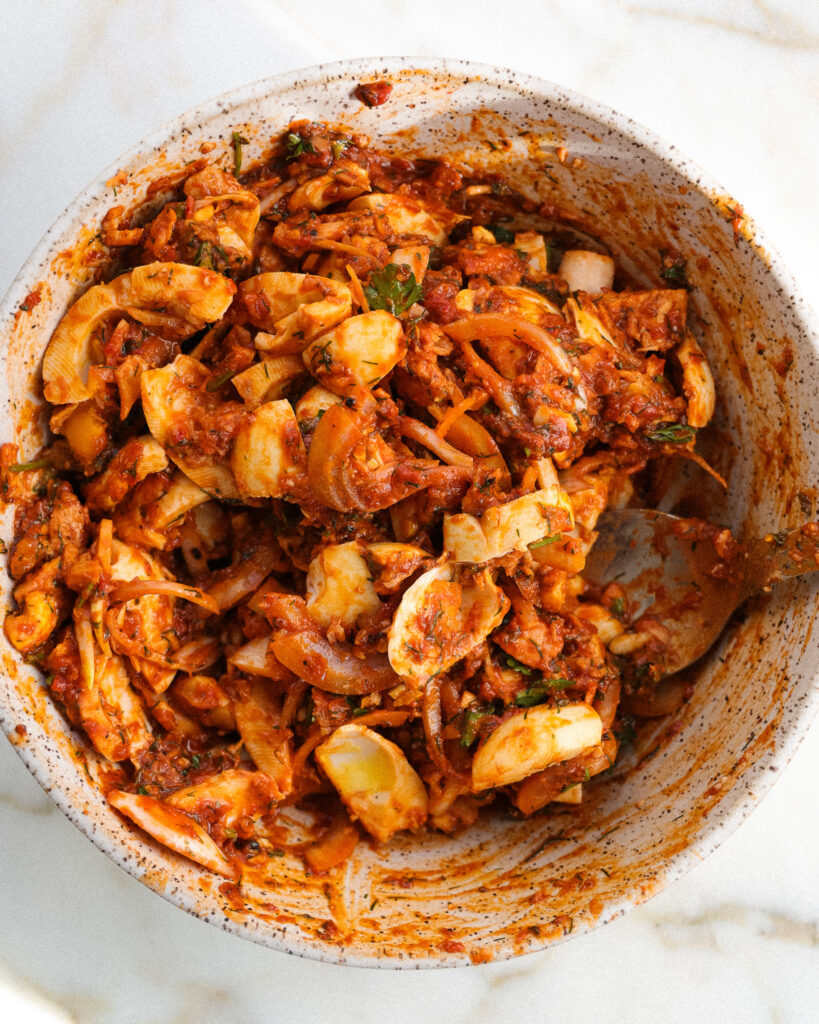 The result is a sauce that’s earthy, savory, slightly tangy, and rich, with a bit more body than its green counterpart. In this recipe, red chimichurri acts as the dressing for the egg salad, coating everything in bold flavor and mimicking some of that mayonnaise creaminess.