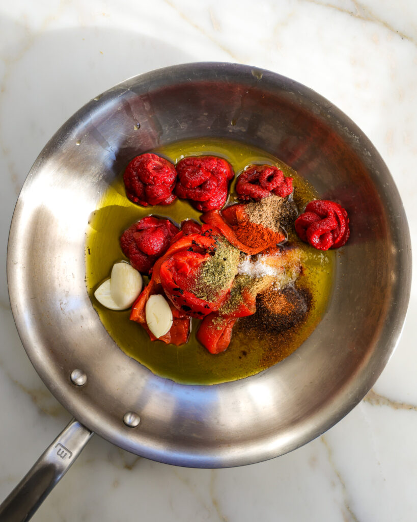 - To a small sauté pan, add 3 tablespoons olive oil, 3-4 smashed garlic cloves, 1/2 teaspoon each of paprika, cumin, oregano, coriander, chili powder, 1/2 cup roasted red peppers, and 5 tablespoons tomato paste.