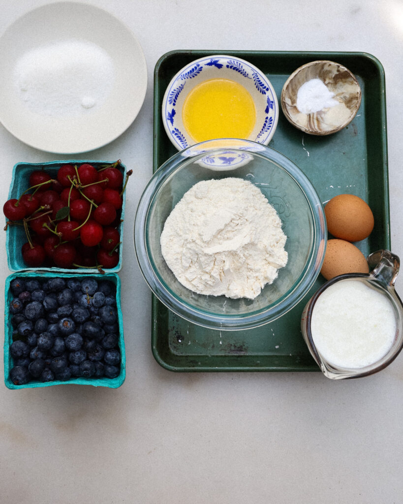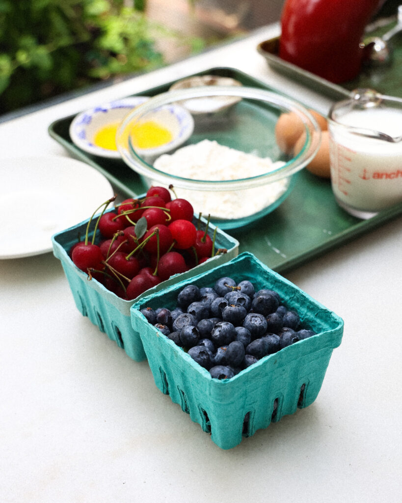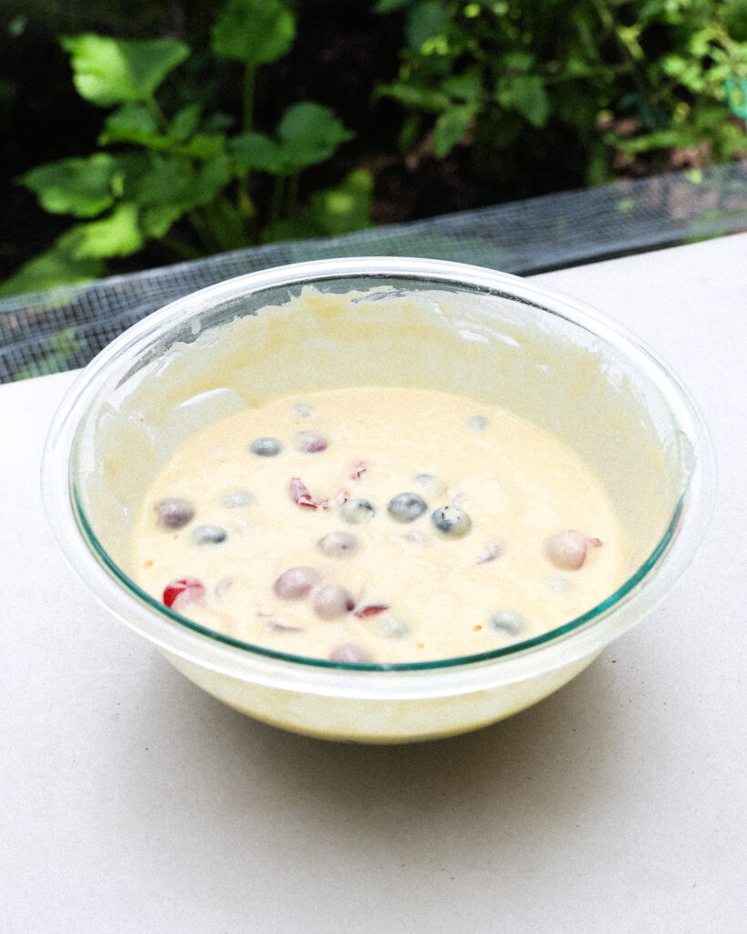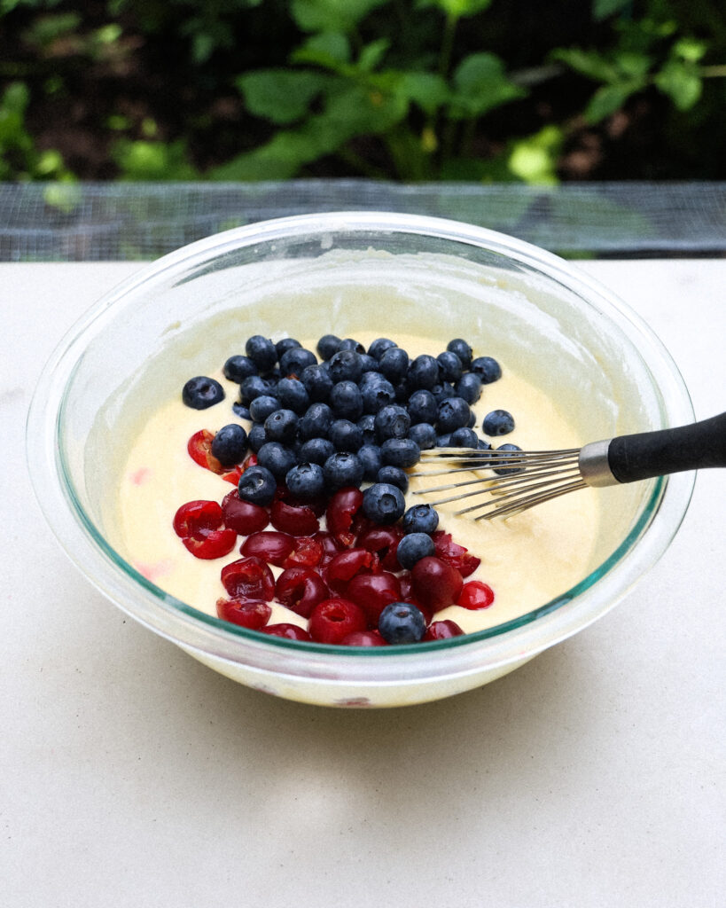 Rinse the blueberries, pit and halve the cherries (unless they’re already small), and fold them gently into the batter. The more fruit, the merrier.
