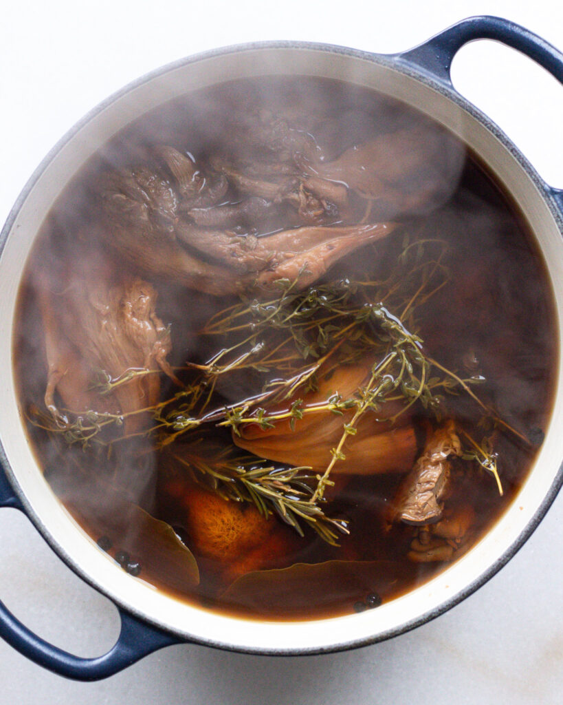 - Take the pot off the heat and remove the mushrooms, bay leaves, and thyme and rosemary sprigs. If you are proceeding with the rest of the recipe, you can reserve the mushrooms. If not, you can discard them.