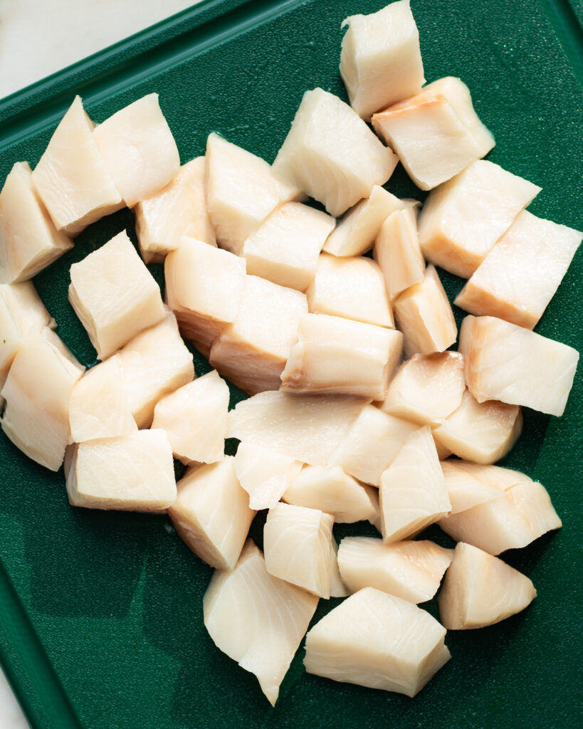 - Cube the pound of sablefish into 1-inch cubes. Roughly tear the kale leaves.